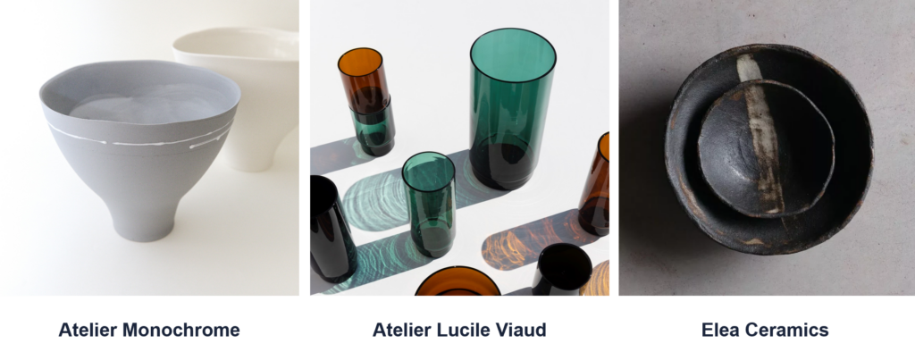 And for the first time this year, we will also be presenting a few pieces from three emerging French brands at this pavilion: Atelier Monochrome and Elea Ceramics, two tableware designers, and the eponymous glass workshop Lucile Viaud.