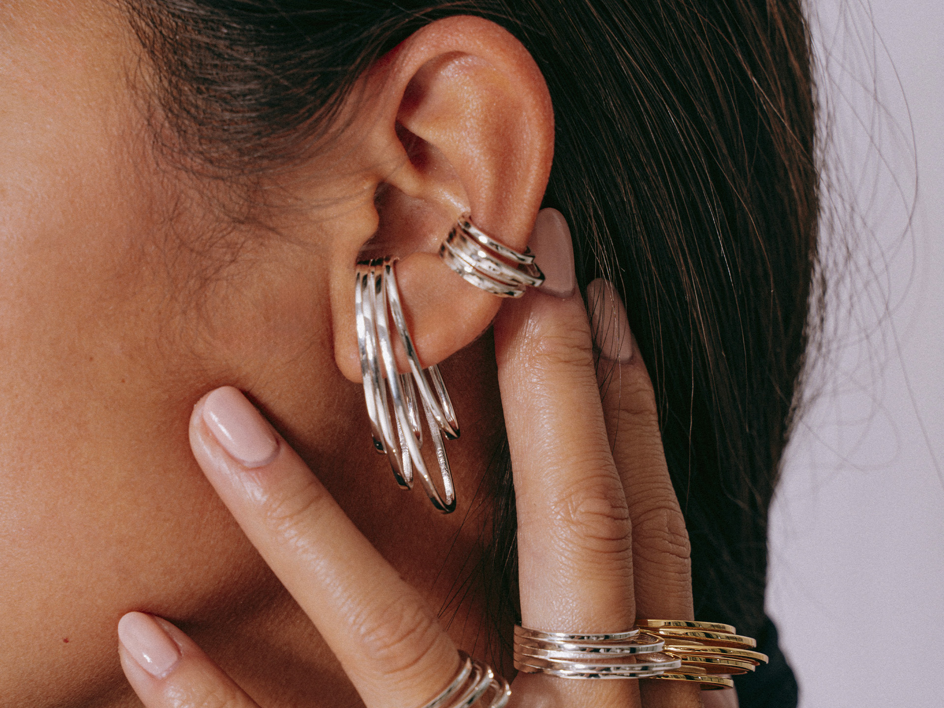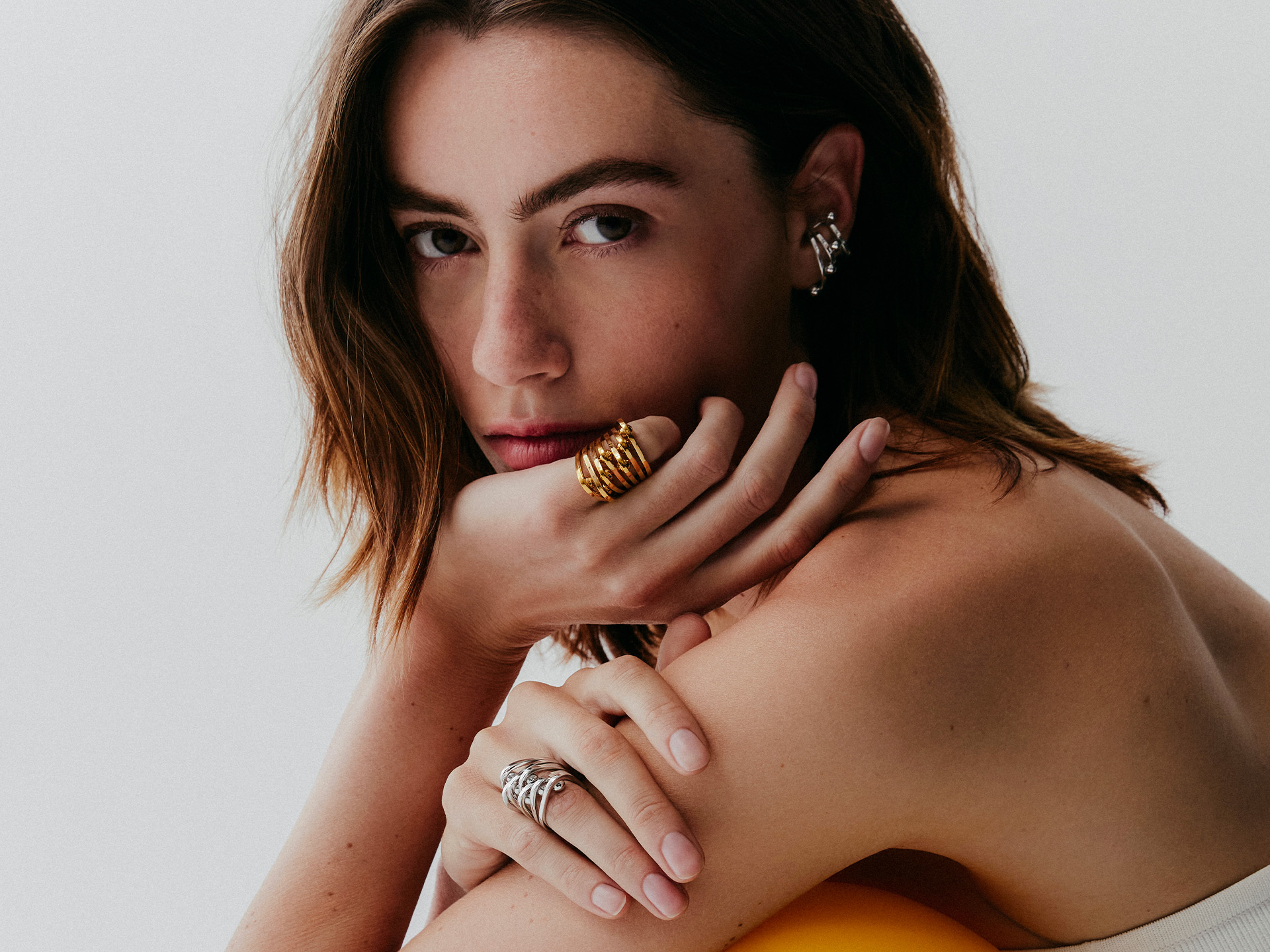 Autodidacte en design 3D, Margaux conçoit chaque pièce comme une structure à part entière — pensée pour dialoguer avec le corps et révéler la posture. Les prototypes sont modélisés dans les bureaux parisiens avant d’être réalisés en petites séries, en argent massif ou en laiton plaqué or 750, dans un atelier responsable certifié RJC.