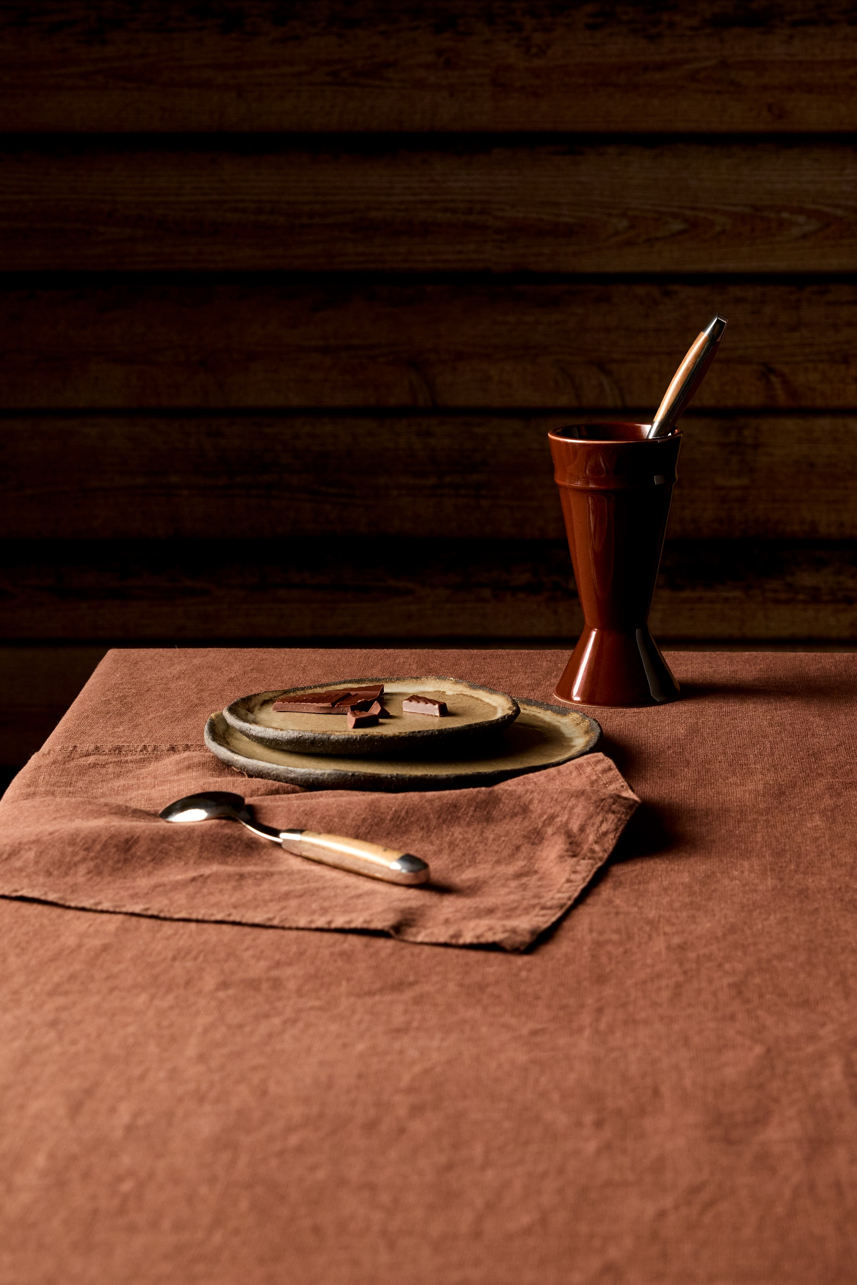 Chez Atelier Leto, ces tonalités ocre prennent vie dans une gamme d'assiettes en grès roux. Le plat Renaissance Rustik de la manufacture Montgolfier relève la composition de nuances plus vives et épicées. Le mazagran caramel de l'Atelier Maison Quatre dialogue harmonieusement avec la carafe couleur châtaigne de Cécile Préziosa, créant un ensemble singulier et audacieux.