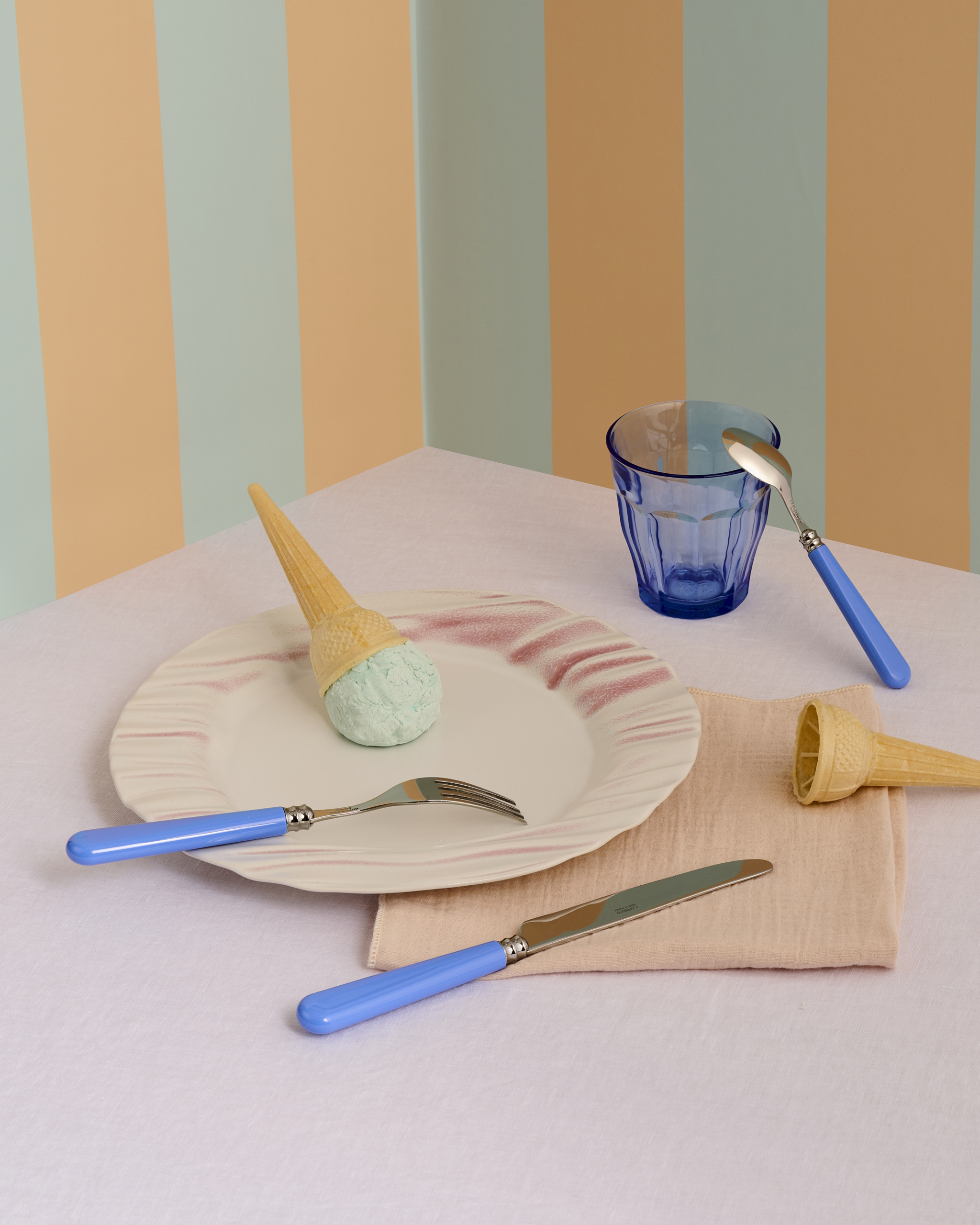 Les manches des couverts se parent également de couleurs pastel légèrement acidulées tels des sucres d’orge, parmes chez Sabre, bleus chez Capdéco ou Claude Dozorme avec sa gamme au nom évocateur Berlingot.
