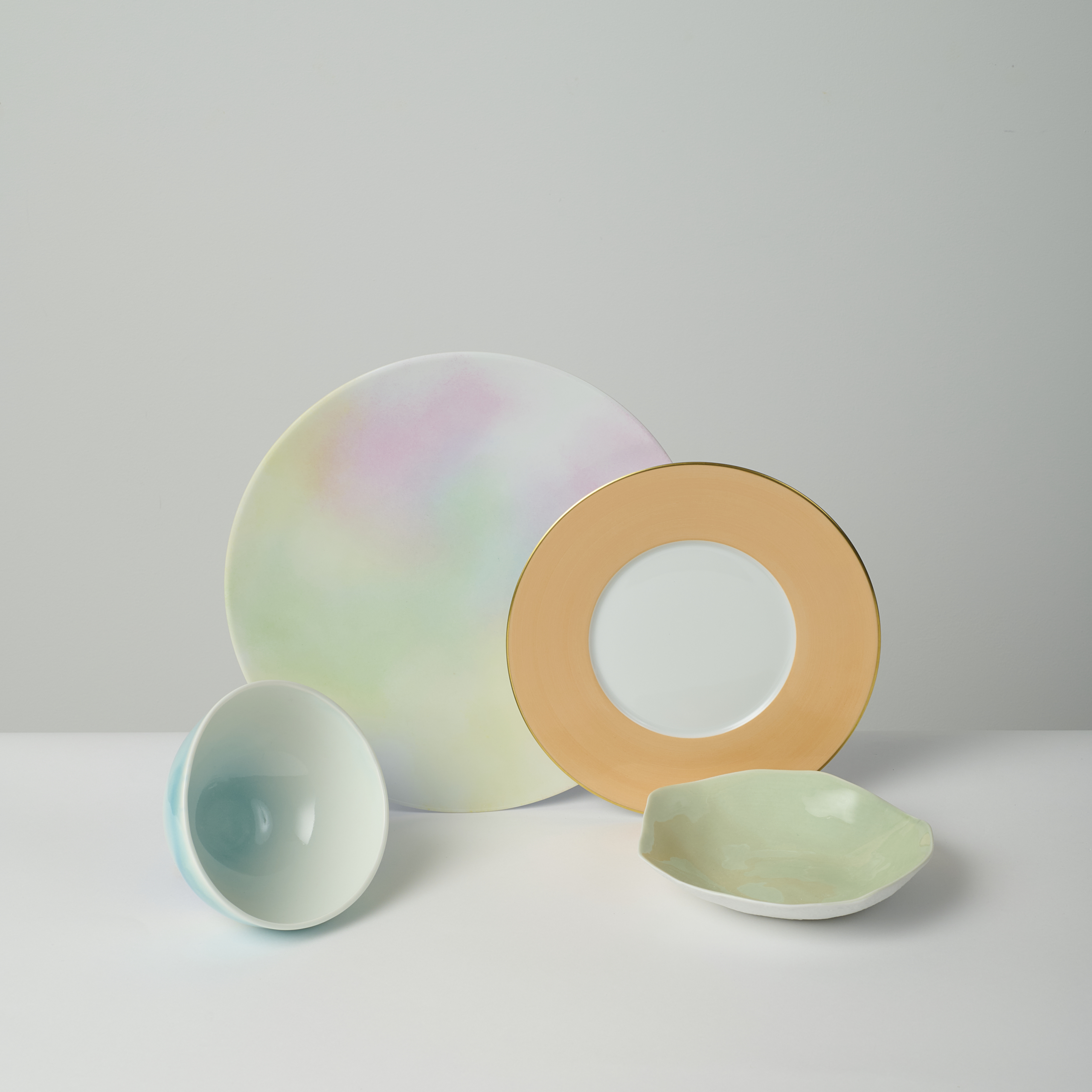 Cette saison fait la part belle à la porcelaine fine et au verre qui subliment particulièrement les tons pastel et les effets lumineux. Le rendu opalescent devient un élément clé : la transparence, la brillance et les reflets donnent aux pièces une dimension presque onirique.
